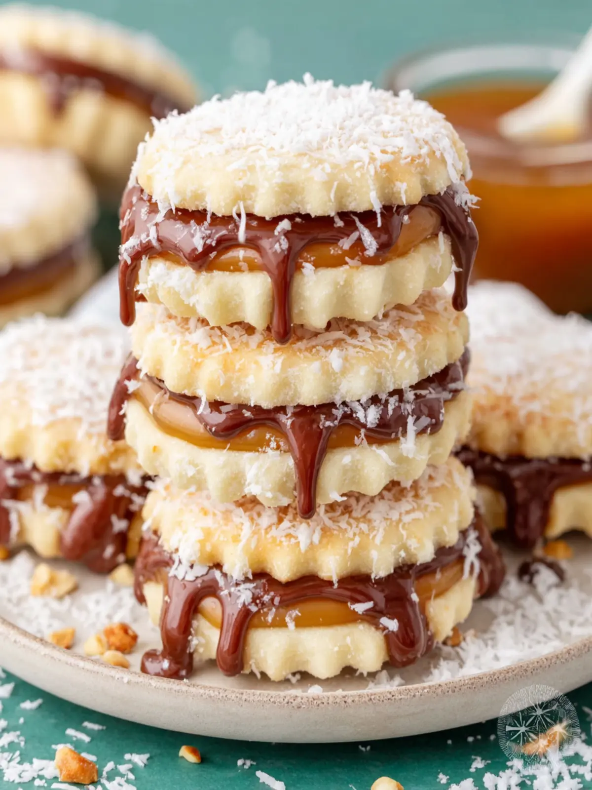 - Roll the exposed dulce de leche in shredded coconut if desired. Sprinkle cookies with powdered sugar before serving.