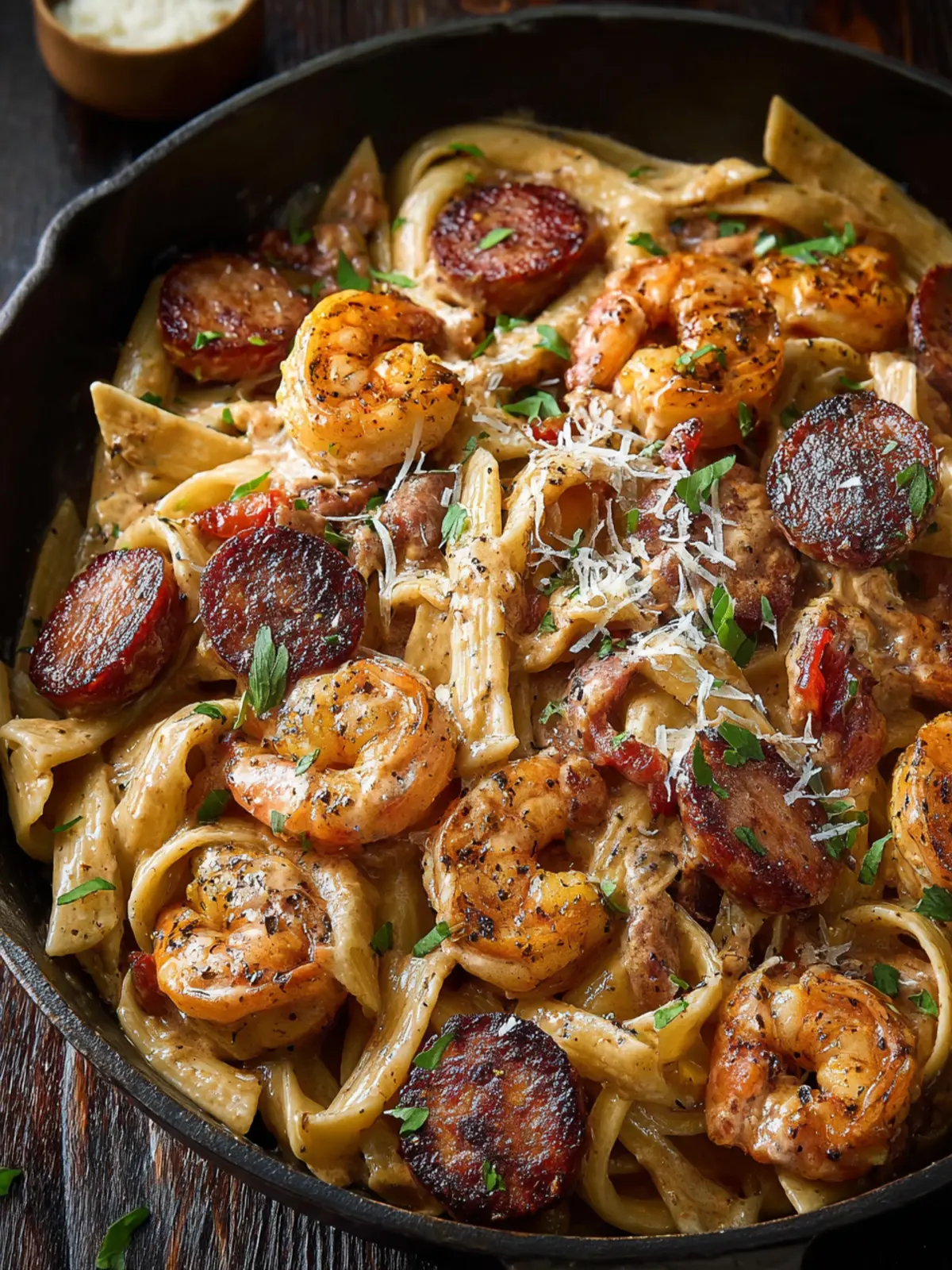 Cajun Spices: Cajun Shrimp and Sausage Pasta wouldn’t be complete without a punch of flavor from Cajun seasoning. You can find it pre-made or create your own blend with paprika, cayenne, garlic powder, and oregano to tailor the heat to your liking.