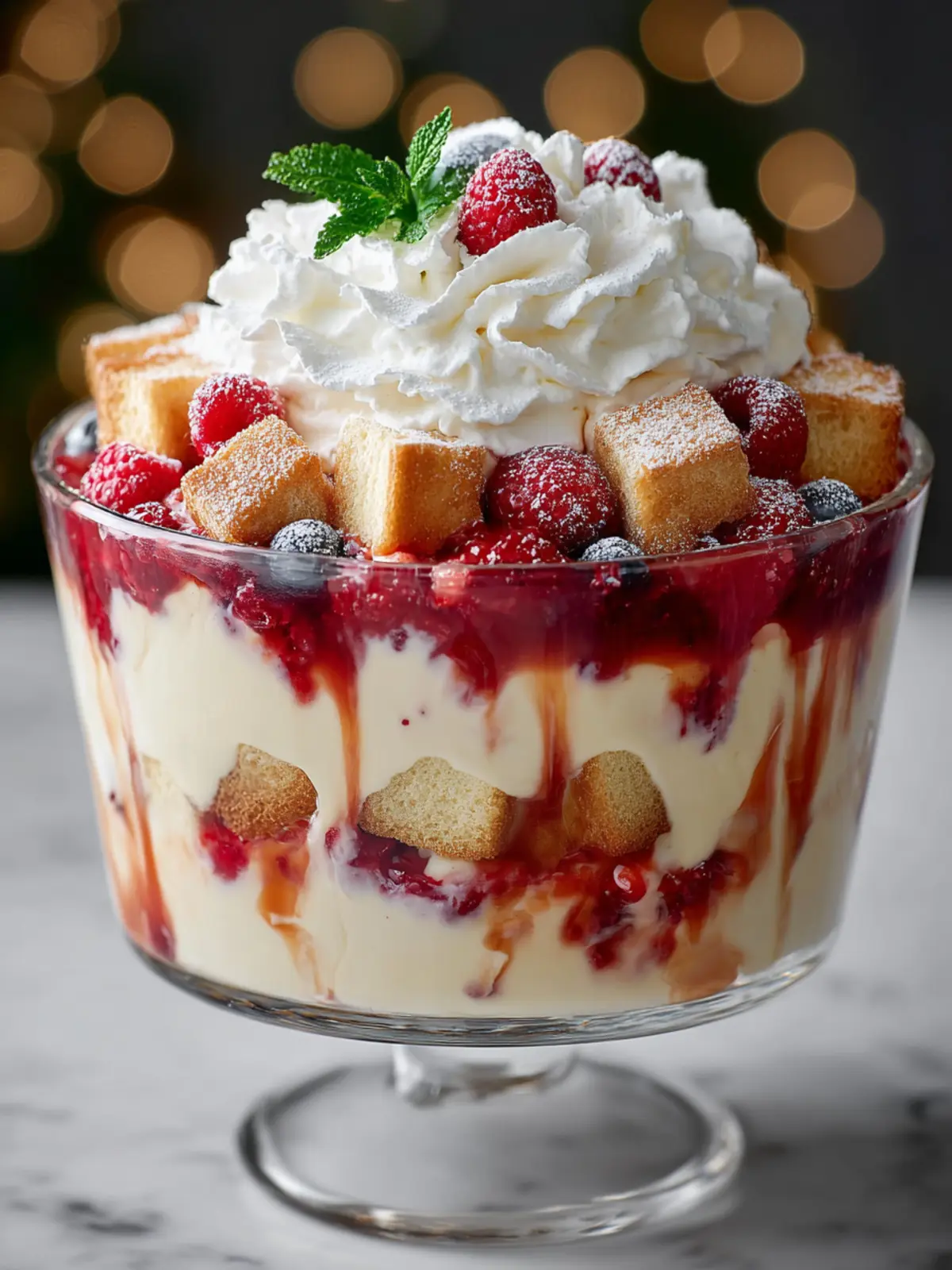 A delightful, colorful holiday dessert featuring layers of mixed berries, custard, and whipped cream.