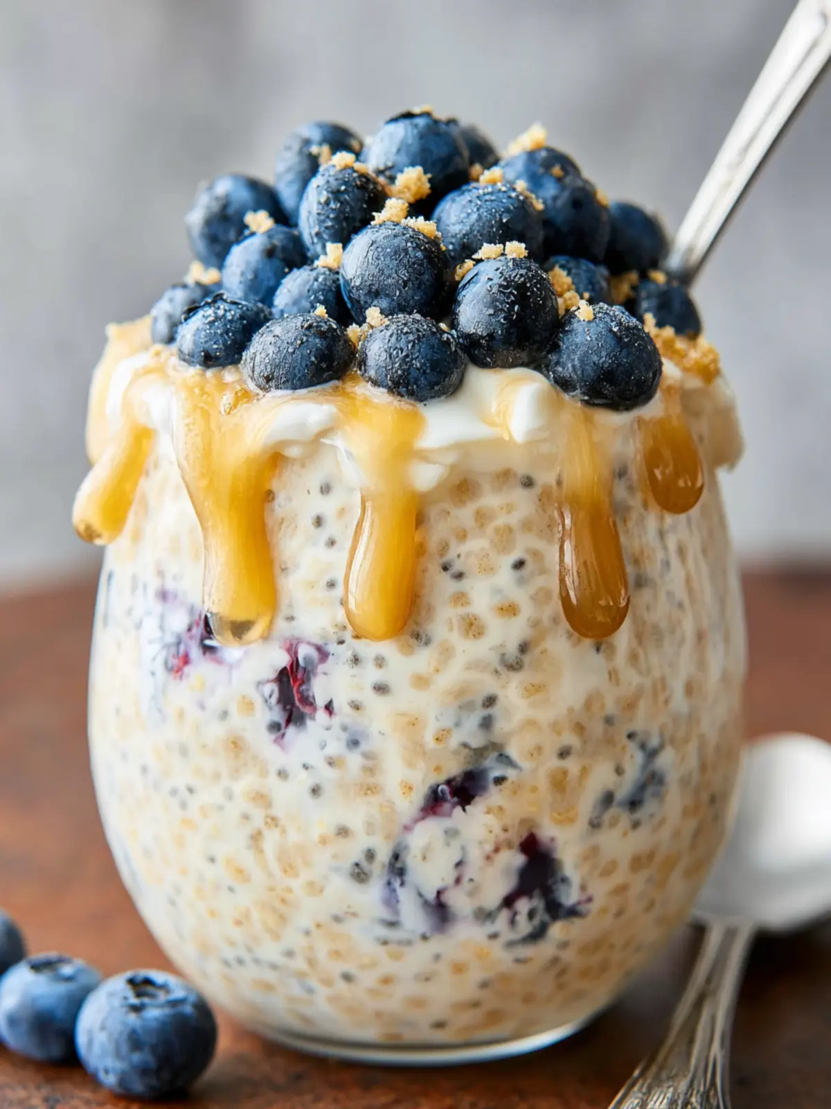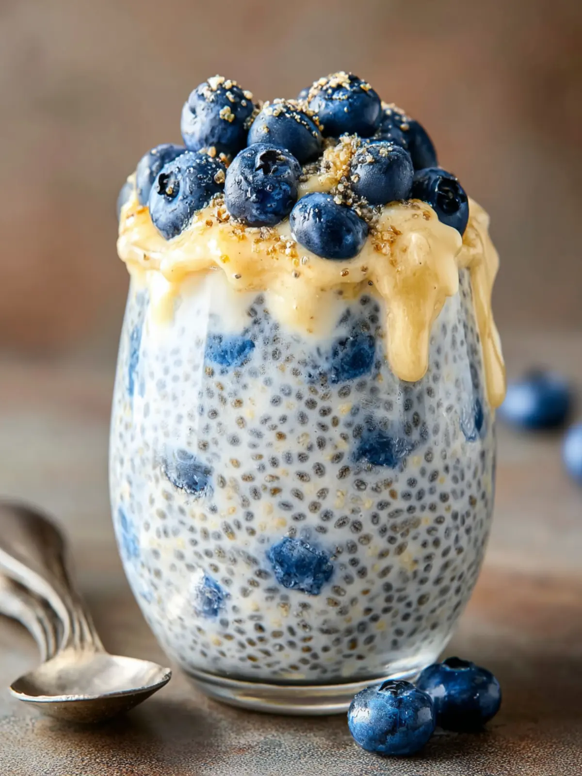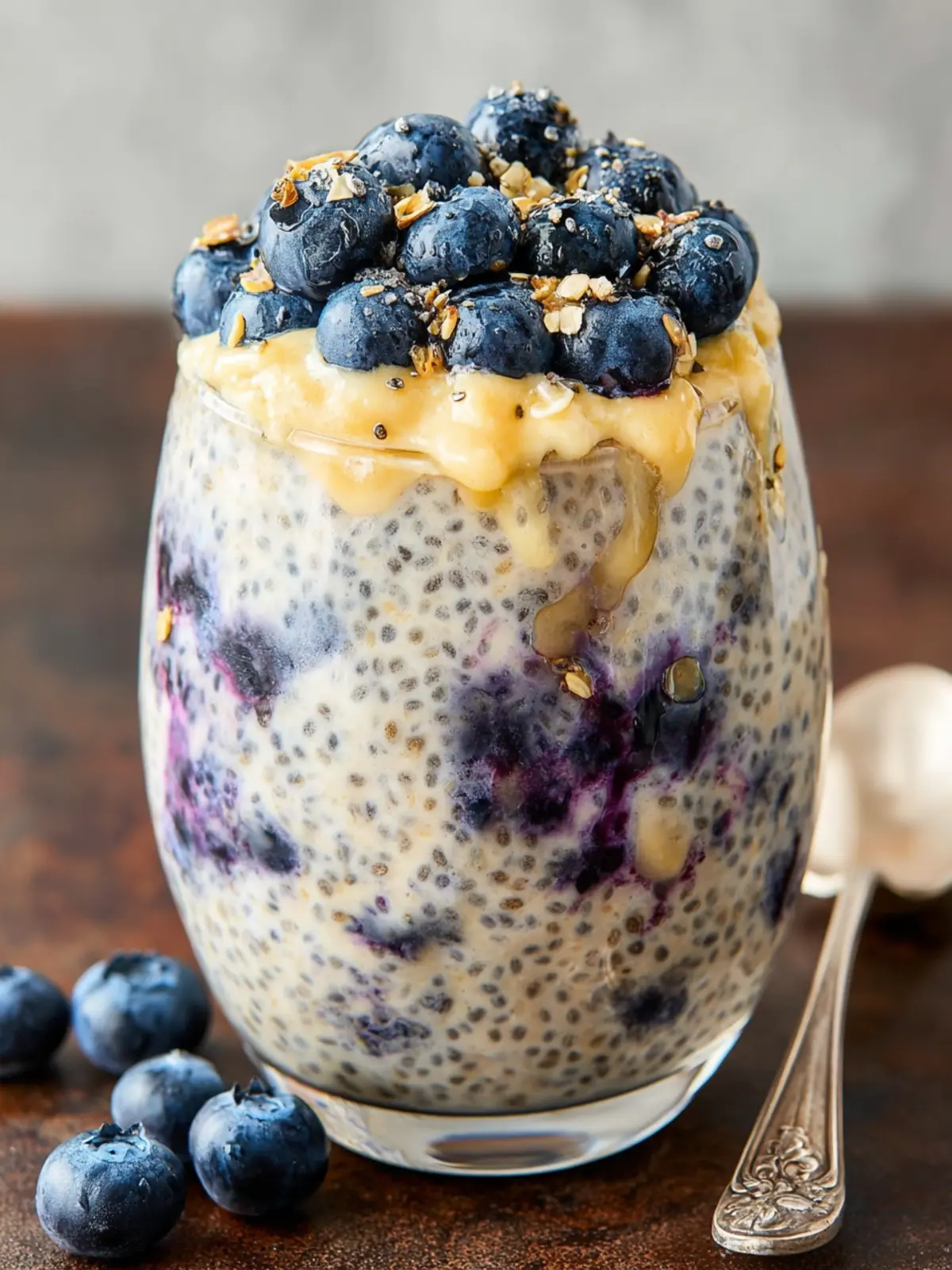 Delicious and nutritious overnight oats with chia seeds and blueberries.