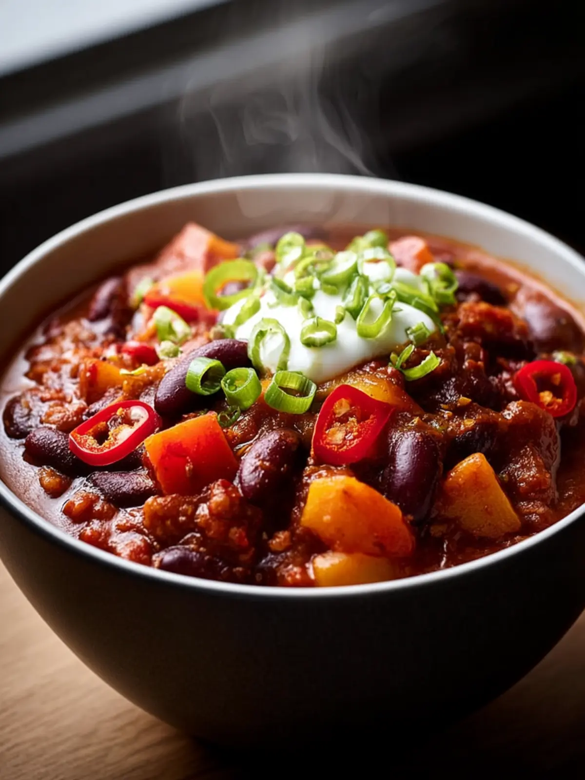 A hearty and flavorful vegetable chili packed with beans and spices.