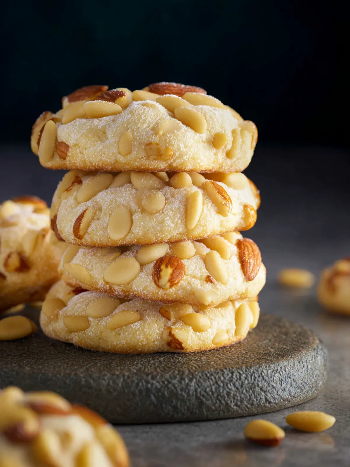 Sugar: Granulated sugar sweetens the mixture perfectly, balancing the nuttiness of the pine nuts and almond flour. A sprinkle of powdered sugar on top enhances both the visual appeal and sweetness.