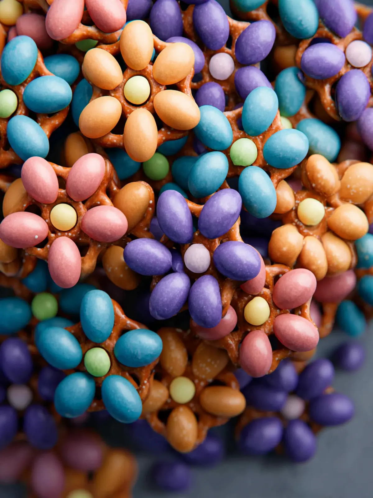 Delicious pretzel snacks topped with white chocolate and pastel M&M’s, perfect for any occasion!