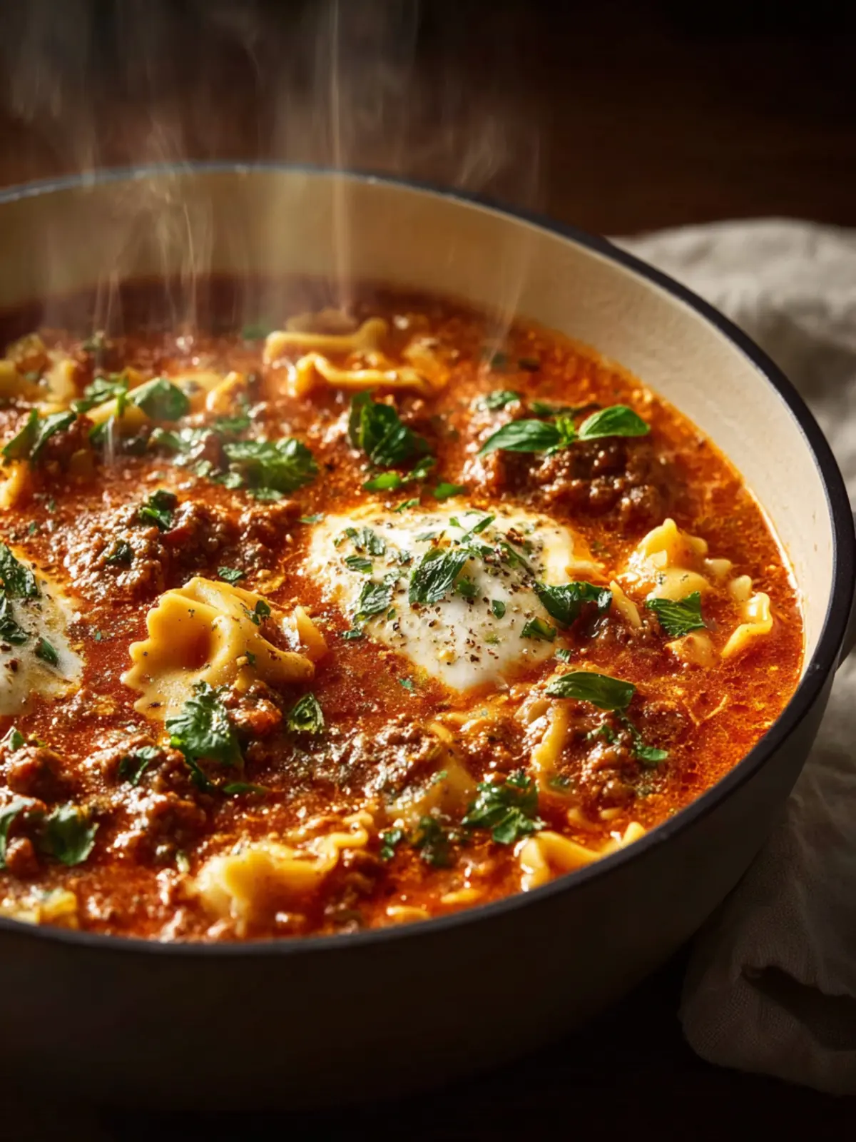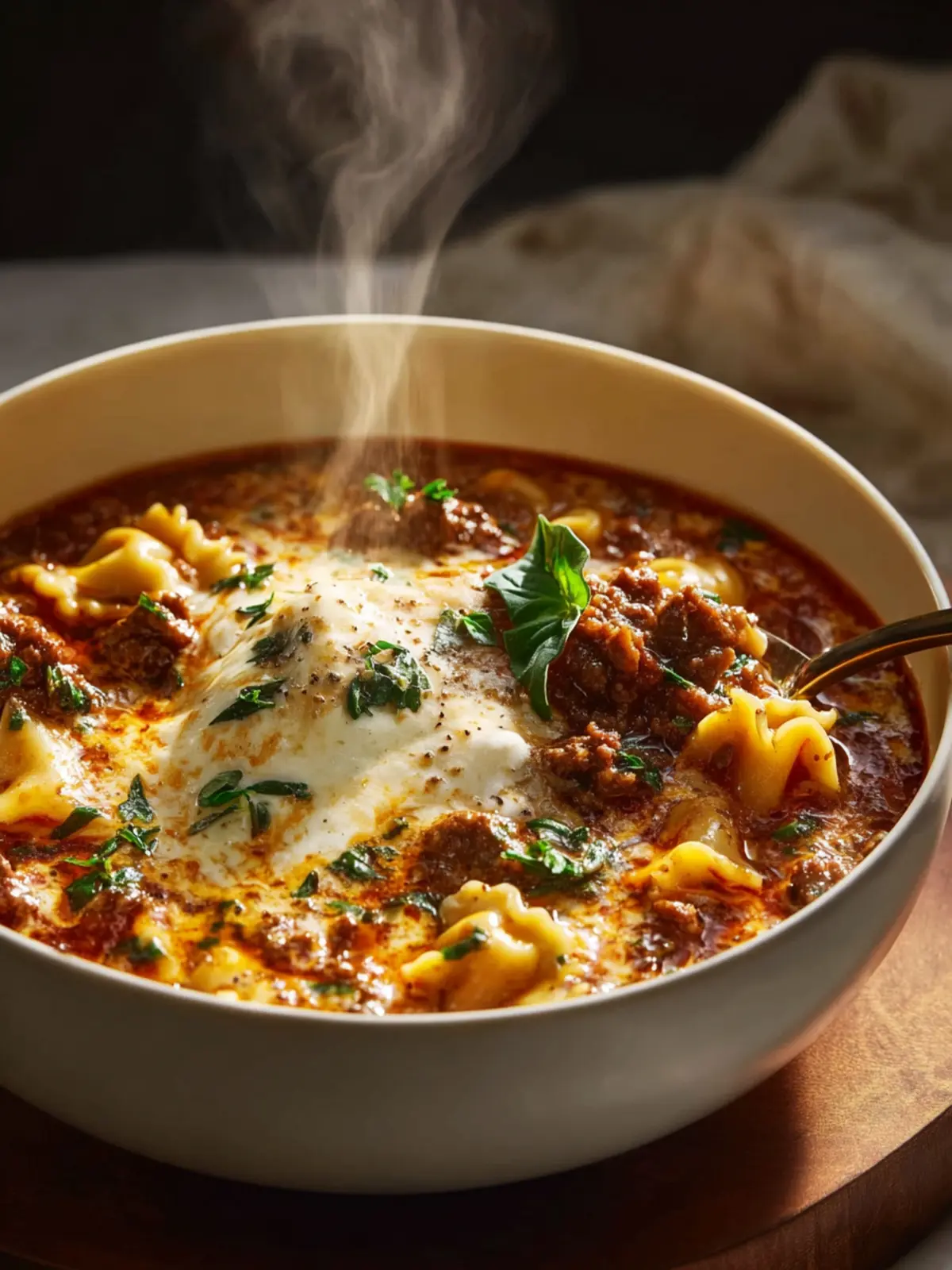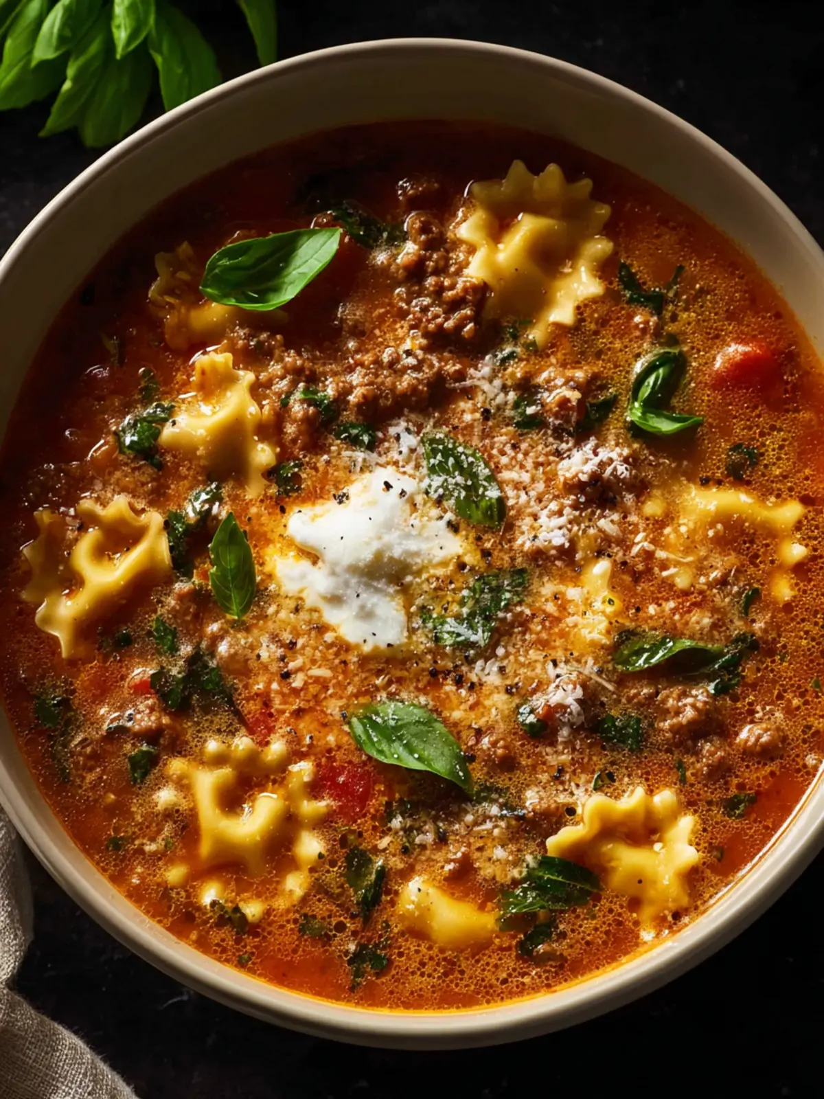 A hearty and comforting beef lasagna soup packed with flavor and cheesy goodness.