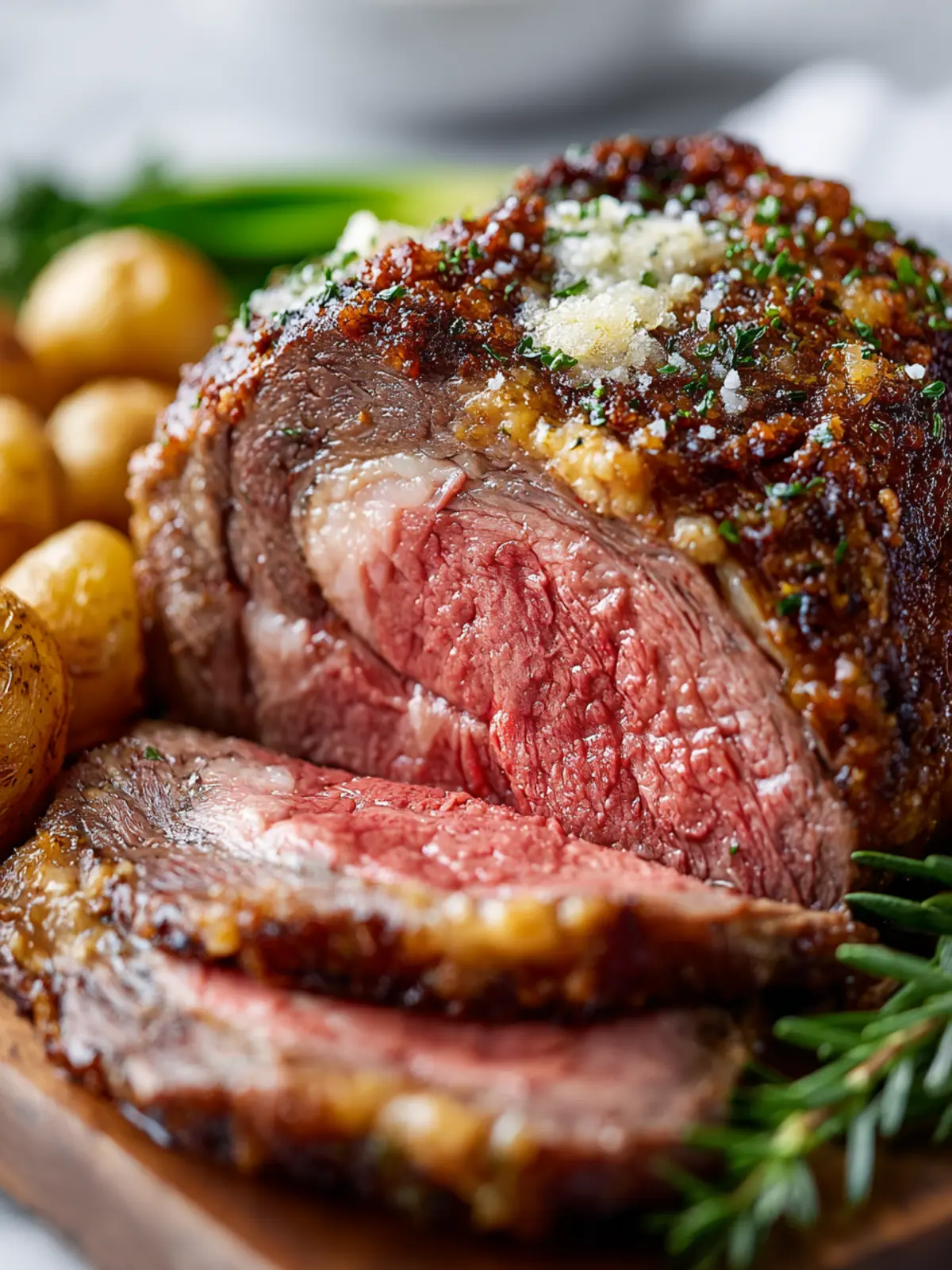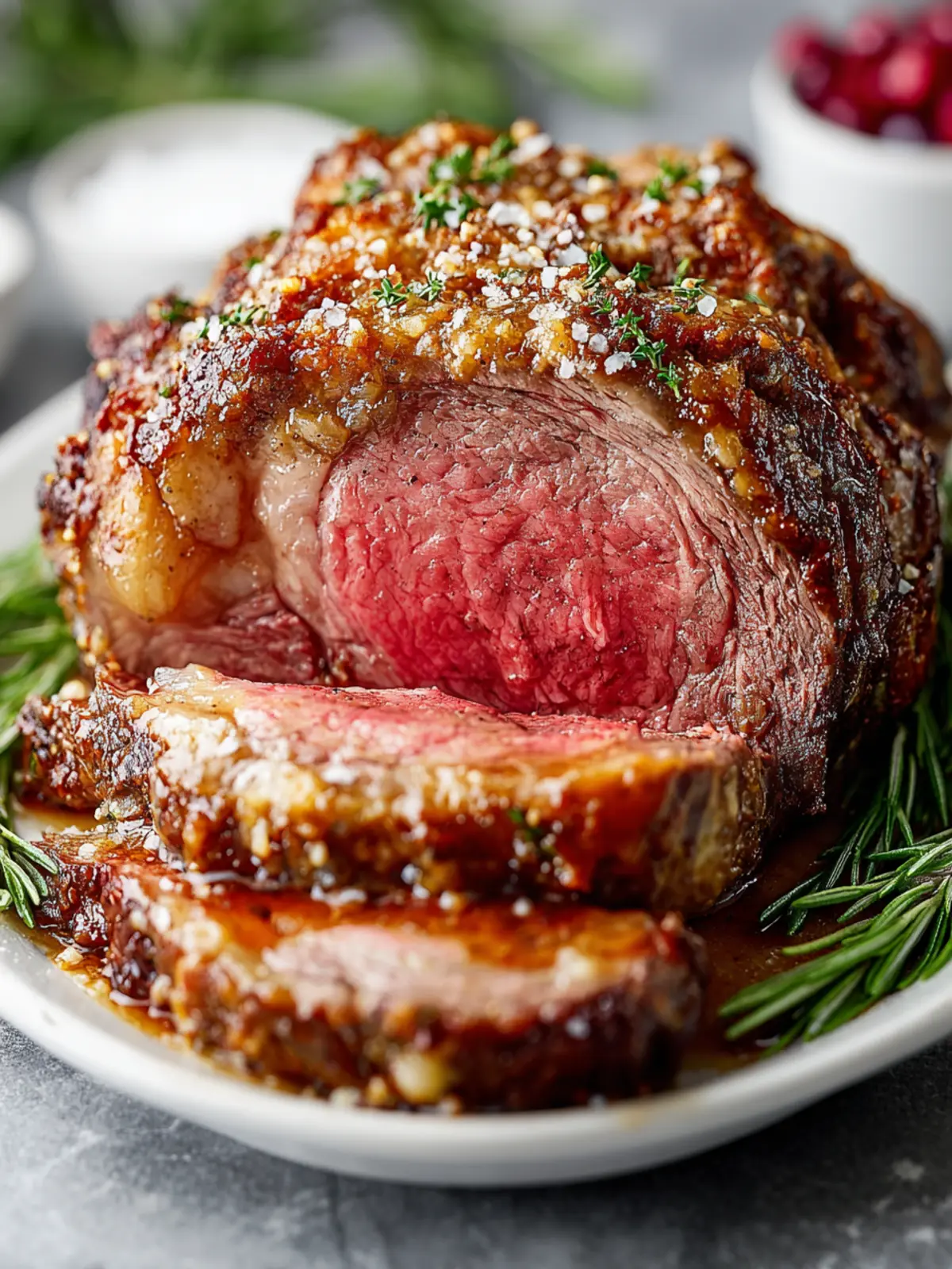 A succulent prime rib roast seasoned with fresh herbs and a flavorful crust.