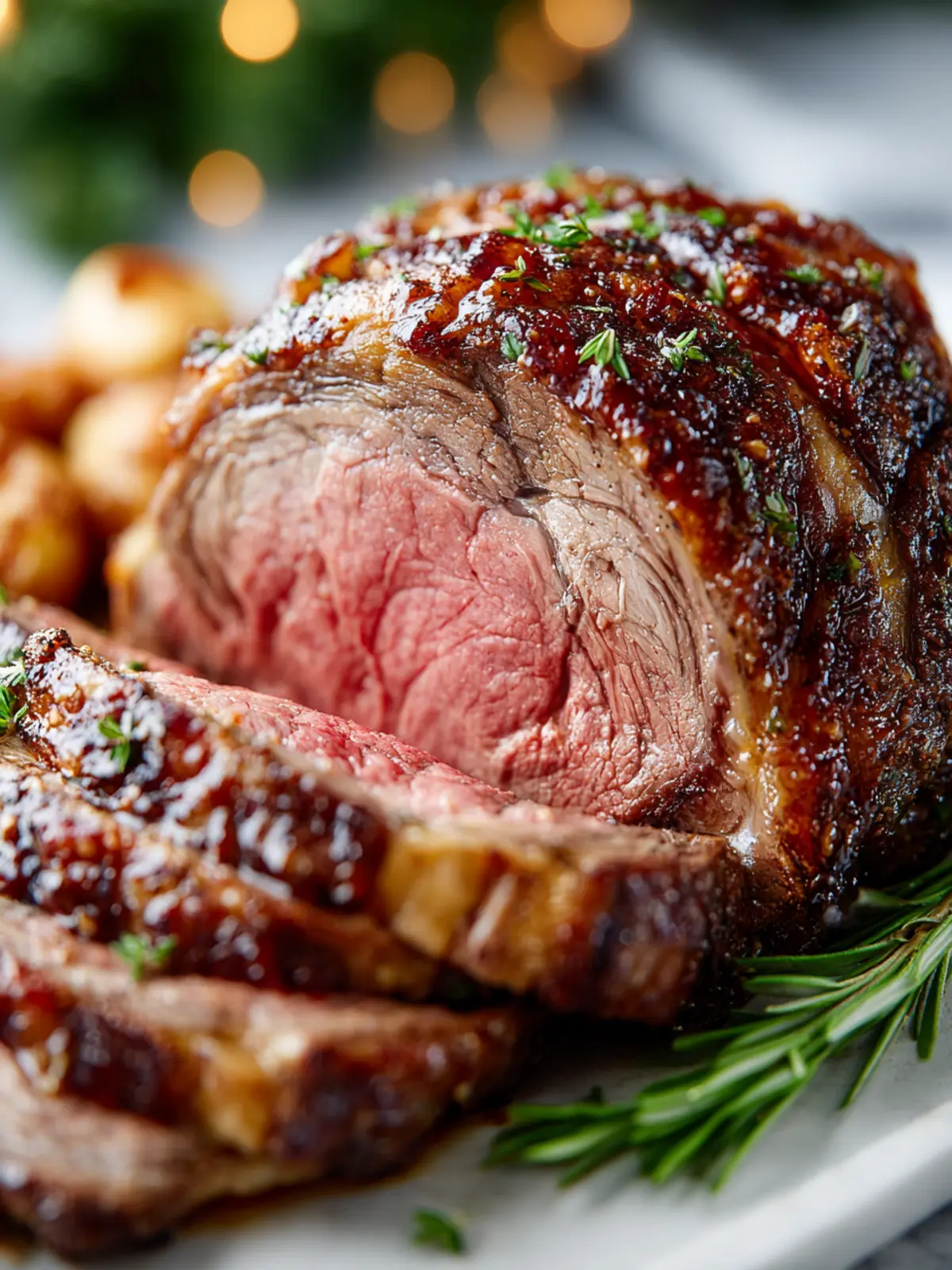 A sprinkle of fresh rosemary and thyme brings an earthy fragrance and flavor that truly make this roast irresistible. These herbs are not just for garnish; they infuse the meat with an herbal aroma that perfectly complements the richness of the beef, making each bite a festive delight.