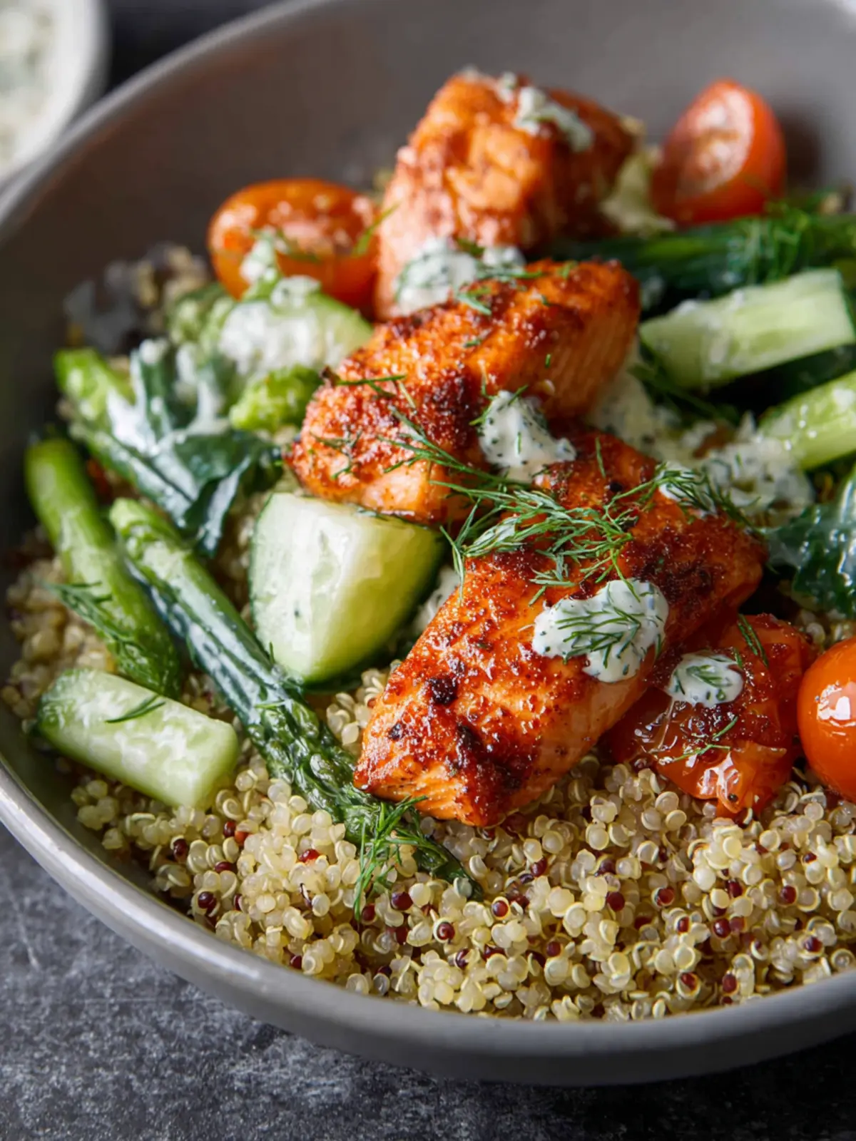 Vegetables: Brighten up your salmon quinoa bowl with a mix of fresh vegetables. Think crisp cucumbers, sweet bell peppers, and vibrant cherry tomatoes. They not only add color but also bring a refreshing crunch.