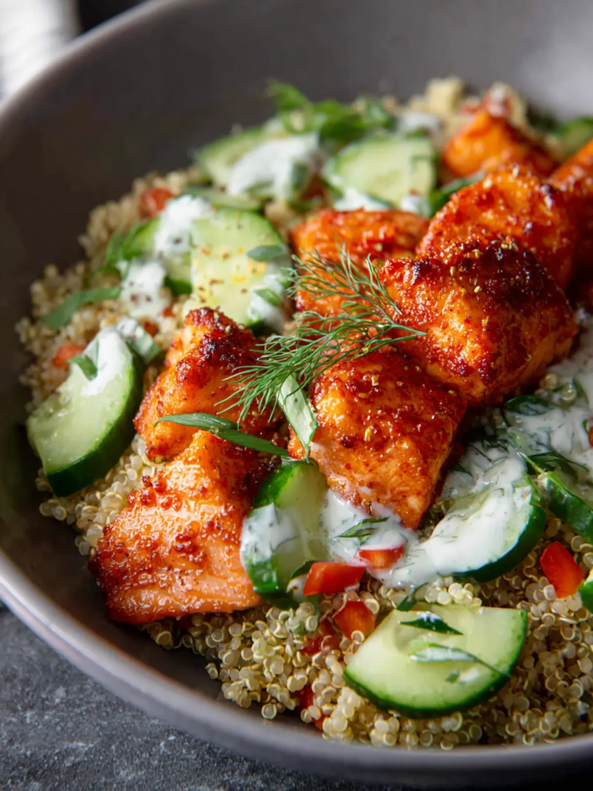 - Once the quinoa and salmon are cooked, assemble the bowls with a layer of quinoa, salmon, cucumber salad, and a drizzle of sauce, and serve.