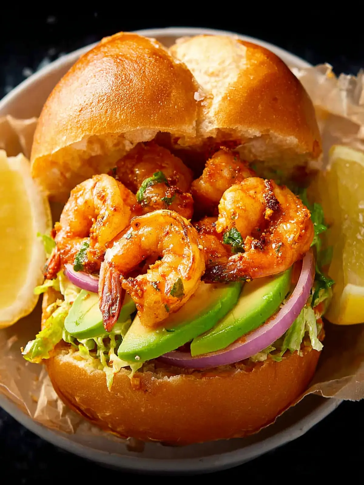 - Assemble Sandwiches. Spread sauce on the bottom half of the toasted bun. Layer 6–9 cooked shrimp over the sauce, then add sliced tomato. Spread mashed avocado on the top half of the bun, place it on top, and press gently to close.