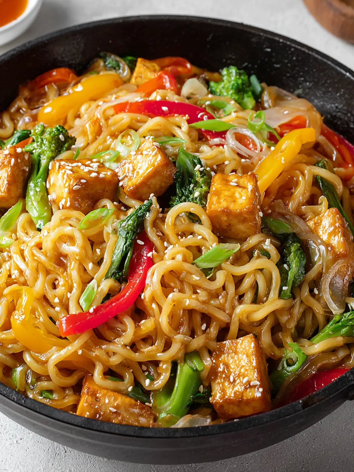 - Once the vegetables are cooked, return the tofu cubes to the pan, add the cooked noodles, cover with sauce, gently toss to combine, and cook for a final 1-2 minutes until the sauce has thickened and everything is well coated.